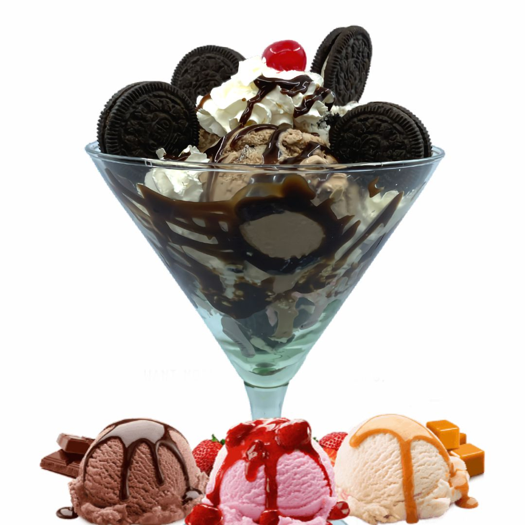 Cuatro (4) bolas de helados, crema chantilly, galleta, cereza, salsas.